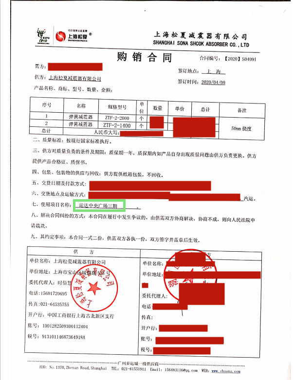 上海松夏減震器有限公司官方網站為您介紹:【長沙運達廣場項目】使用ZTF可調式彈簧減震器采購合同信息,我們松夏公司2020年為【長沙運達廣場項目】使用ZTF可調式彈簧減震器,起到了減震和降噪的作用,以下是【長沙運達廣場項目】使用ZTF可調式彈簧減震器采購合同介紹